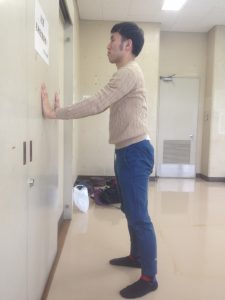 右脚を一歩前に踏み出す女性とその女性の膝を抑える男性